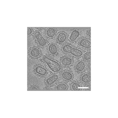 インフルエンザウイルスのゲノムRNAは8本に分節化しています。しかし、8本に分かれたゲノム分節が子孫ウイルス粒子にどのように取り込まれるのか、長年の謎でした。私たちはインフルエンザウイルスを人工合成するリバースジェネティクス法や様々な電子顕微鏡法を組み合わせ、8種類8本のゲノム分節が規則的な配置をとって子孫ウイルス粒子に選択的に取り込まれることを解明しました。現在はその分子機構の解明を目指しています。(図)電子線トモグラフィー法により3次元再構築したインフルエンザウイルス粒子。
