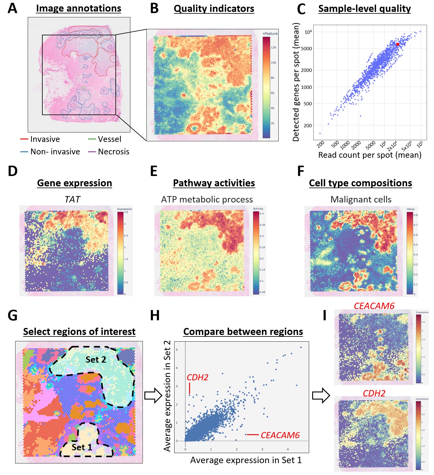 (G–H) ユーザーは任意の領域をインタラクティブに選択し、その平均遺伝子発現を算出できます。
