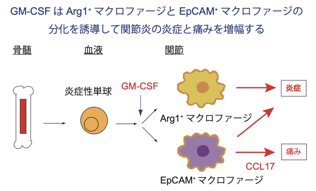図) 骨髄から血液中を移動してきた炎症性単球は関節に入るとGM-CSFの作用を受けてArg1+およびEpCAM+マクロファージに分化し関節の炎症増幅に関わる。特にEpCAM+マクロファージはCCL17を介して痛みにも関わっている。